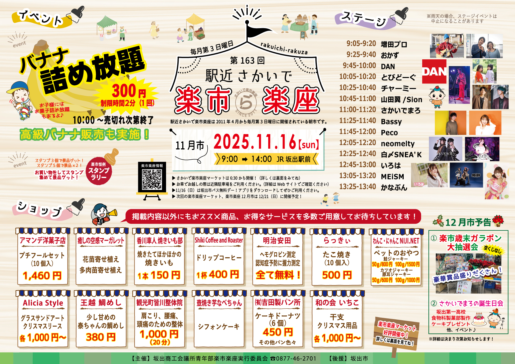 暑い夏が嘘のように、寒さを感じるようになりました。さかいで楽市楽座11月市のご案内です。
